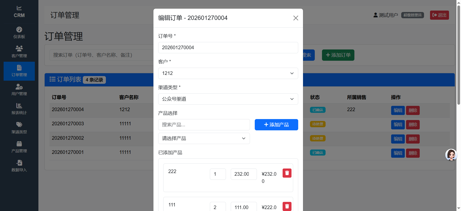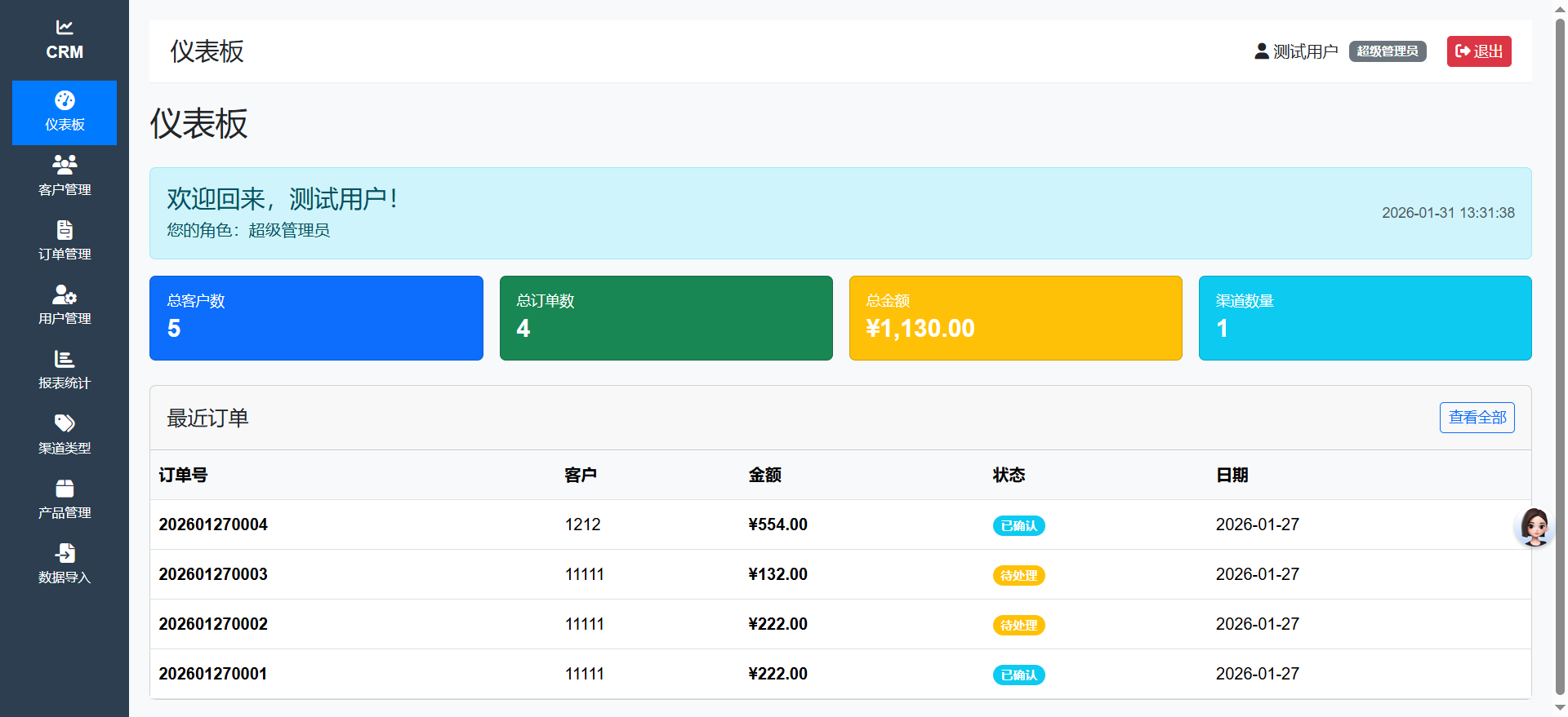 实时展示关键业务指标,包括客户总数、订单统计、销售业绩等数据可视化图表。