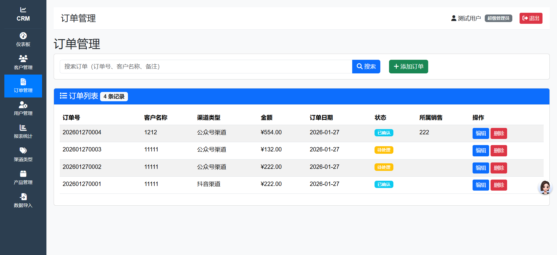 users - 用户表customers - 客户表orders - 订单表channels - 渠道表